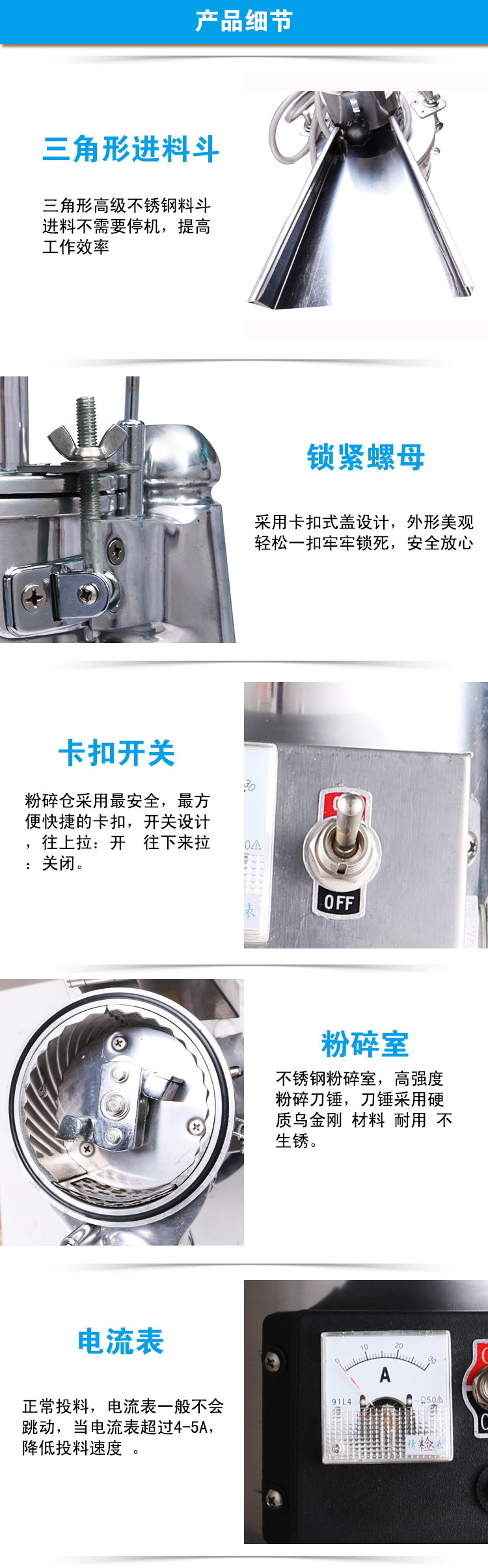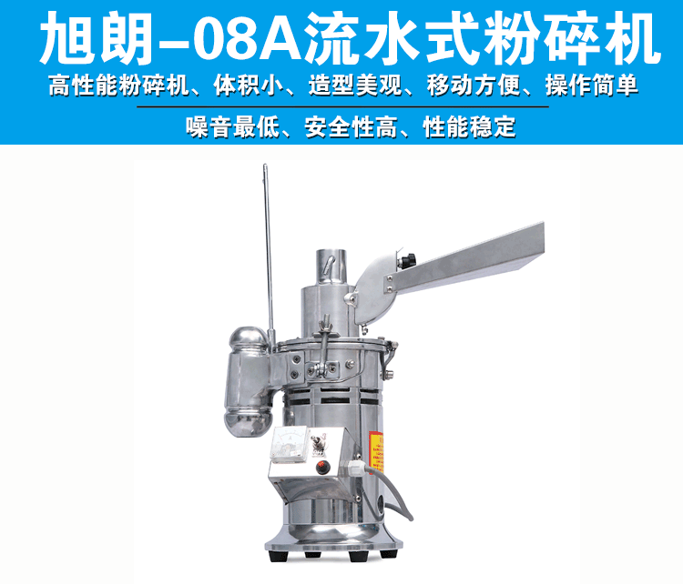 噪音低、安全性高、性能稳定、卫生洁净、损耗极低、效率高、细度准确可调;与药物接触部分用不锈钢制作,