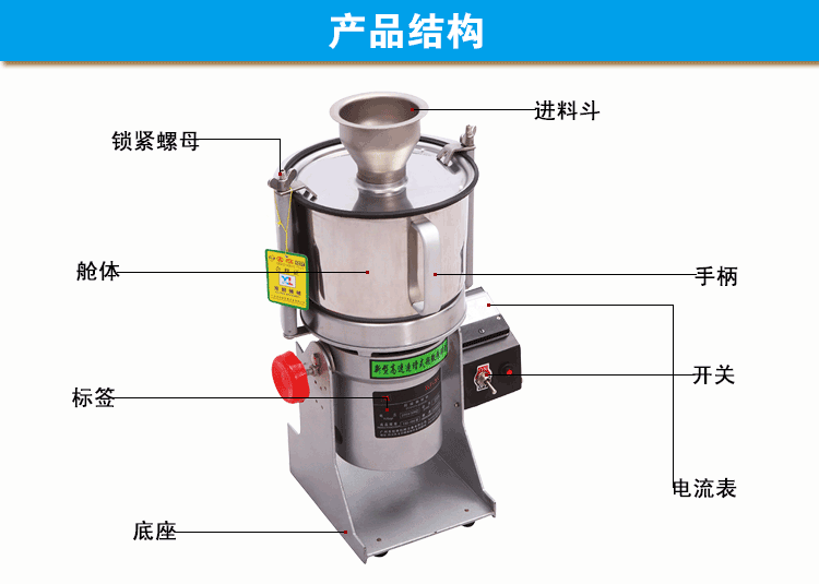 本机器是小型粉碎机,流水粉碎机,研磨机三机为一体之功能。 具有体积小,重量轻,性能稳定,操作方便,
