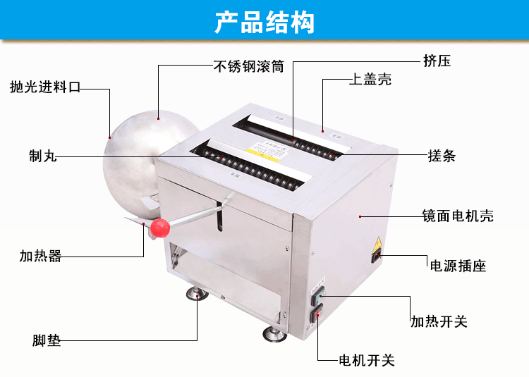 2、本机连续出条、搓丸、烘干一次完成,且丸型光圆大小均匀,不易破碎,无需进行筛选;