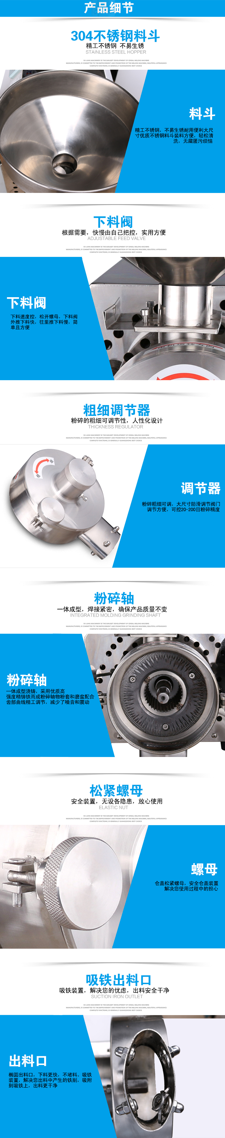 注意事项 1、磨粉机一定要外接断路保护(过载保护)装置,以保护电机和人身安全。 2、本机只能磨干性物料,物料越干,能磨越细。 3、380V磨粉机需请专业电工进行安装,确保磨粉机按照规定方向运转,方能确保磨粉效果。由于电源缺相导致电 4、220V磨粉机需请专业电工外接标准地线,才能避免电机罩和机头的静电。 5、磨粉机需固定在牢固稳定水平的桌面和柜台上,才能减轻震动和噪音。 6、未满18岁人员、超过65岁老人、弱智及动作迟缓者、未经学习培训、未仔细查看使用说明书的人员,一律不得 7、在加工过程中,如因停电等原因突然停机,必须清除粉碎腔内的残余物料后,才能再次启动。 8、如发现机器零件有严重磨损或损坏时应及时进行修理或更换。 9、机器启动后,应待运转正常时才能放料加工,注意进料量防止电机超载闷机。 10、每次用机结束后,应将机器内部清理干净,并通风晾干。 11、机器较长时间不用时,应切断外电源。机器勿到置,要平放,上面不要放重物。 12、本机保修一年,人为使用不当引起的损坏,以及正常磨损,不属保修范围。需返回销售单位或者厂家进行维修, 加工范围 1.各种粮食:芝麻、核桃、大米、黑米、黄豆、绿豆、红豆、花生、莲子、玉米、高粱、大麦、荞麦、燕麦等; 2.各种干性药材:淮山、杏仁、茯苓、红枣、芡实、枸杞、薏仁、山楂、淮山、首乌、红豆、阿胶、乳香、菟丝子、