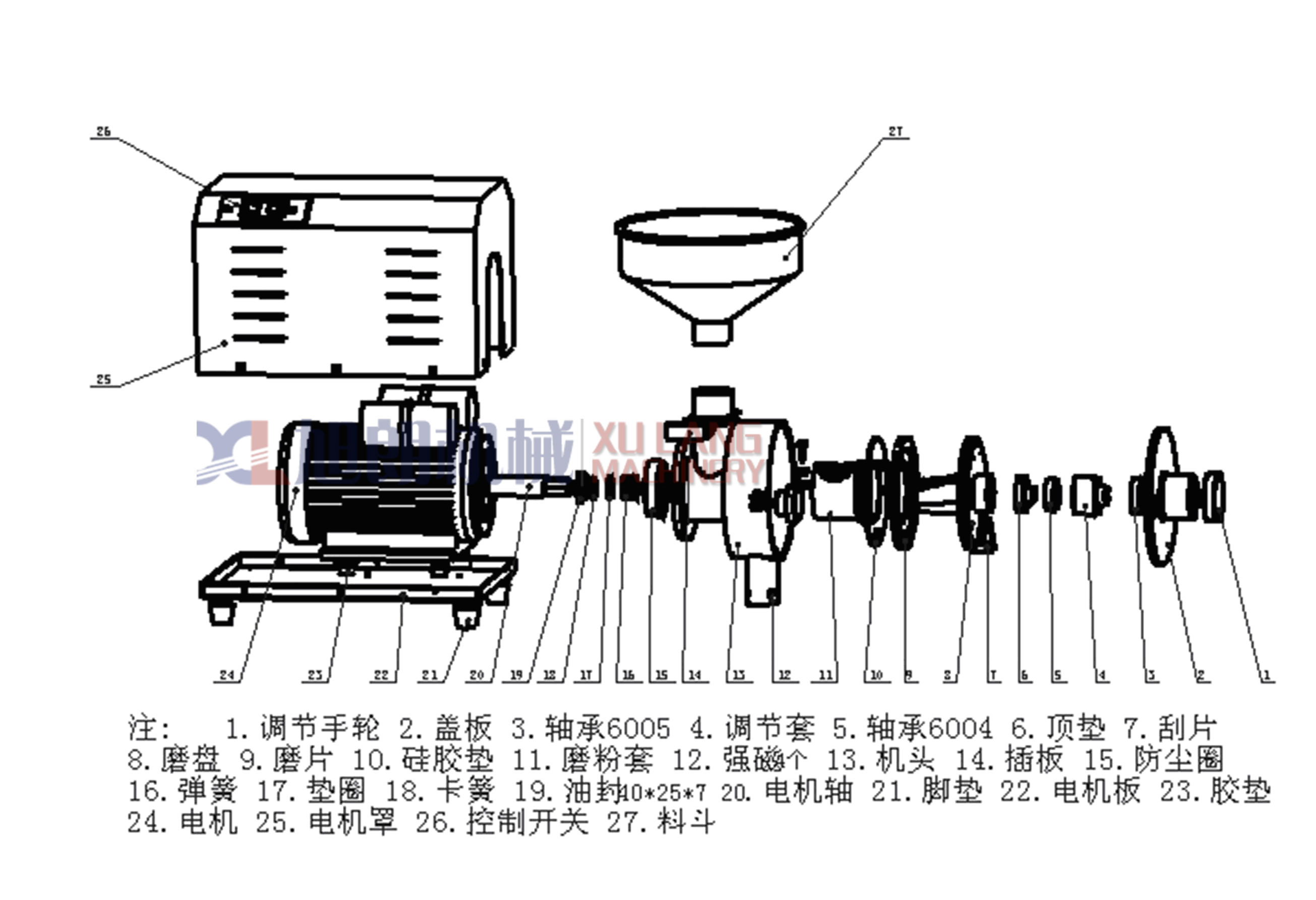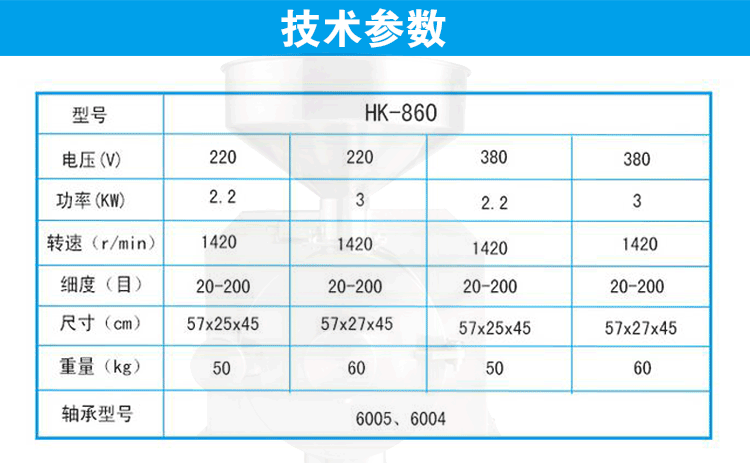 HK-860半岛集团公司分解示意图 ![]() ![]() ![]() ![]() 一.860半岛集团公司优势说明: 1、 860磨粉机不再采用低功率电机,220V有2.2和3KW两个功率,380V仅有2.4KW一个功率。新款磨粉机的电 2、 静磨片与机壁之间加装了硅胶垫,起到减震、微调磨片的效果,使两块磨片吻合更好,磨粉更细,噪音减弱。 3、 860磨粉机,电机与电机固定板之间,电机固定板底下,均加装橡胶垫,进一步加强减震和降噪效果。 4、 860磨粉机门盖和腔体之间,采用紧密加工方式,以台阶位配合方式,确保不漏粉,确保调节器顶垫和磨 5、 860磨粉机的粉碎腔坡度(即静磨片安装位),采用科学设计,进一步保证了磨粉的细腻度,达到进口即 6、 860磨粉机的调节器槽牙,采用高级机械加工中心,确保加工精密度,达到了方便调节、配合紧密、噪音 7、 磨粉机的磨盘装上磨片和刮片后,经过电脑动平衡检测,进一步保证了同心度和重心的平衡度, 8、860磨粉机的底座和电机之间没有轴承,便于客户拆装,又减少了故障发生,提升了机器品质。 9、磨粉机达到了出料顺畅、磨粉非常细腻、噪音和震动比老款小很多的效果。 860磨粉机,每台均配送价值200元的大礼包,含2副磨片(机器上本身自带1副)、不锈钢下料棒1根、 磨粉机的电机启动运转时,连接轴以及套在连接轴上的磨盘一起运转。待磨物料从料斗进入磨粉套,磨盘 三.技术参数 四.操作与调整 1、磨粉机应放置在水平、固定、结实的水平桌面或者台面上,厚实木更佳。 2、由于磨粉机电机在工作后会不断产生热量,所以磨粉机应放在宽敞通风处,有利于散热降温。如果 3、将机盖打开,再将磨盘固定在连接轴上,再用两个大拇指按压在磨盘上,如果磨盘能够自由伸缩,说 4、启动电源,运转1分钟左右,将物料放进料斗,将调节器拧至适当位置,打开下料挡板,使物料缓慢地 5、 磨粉的粗细取决于两块磨片之间的间隙,而磨片的间隙靠调节器进行控制,根据机盖上的粗细指示, 6、调节器的调节范围和力度该如何控制,可以通过耳朵听磨片摩擦产生的声音以及电机运转的声音来决 7、单独磨含油量特别高的物料如芝麻、核桃、花生等,因为这类物料的含油量特别高,只能磨成粗粉, 8、动磨片和静磨片的装卸:装在磨盘上的为动磨片,装在粉碎腔的为静磨片。将固定磨片的3枚螺丝取下 五.注意事项 1、使用前详细阅读使用说明书,严格按照操作规范操作机器,每次开机前,应检查静磨片、动磨片、刮片 2、磨粉机一定要外接断路保护(过载保护)装置,以保护电机和人身安全。 3、加工五谷杂粮、中药材等,应先烘干或烘熟,清除石块、金属等杂物。物料受潮变软或者发粘后,应该 4、每次使用机器结束后,应将机器内部清理干净,不得用水直接冲洗,并通风晾干。 5、严格按照规定接地线,电机应以逆时针方向运转,机器正常运转无异常、无异动、无异响时,方可操作 6、磨粉机需固定在牢固稳定水平的桌面和柜台上,才能最大地减轻震动和噪音。 7、在加工过程中,如因停电等原因突然停机,必须先关闭电源开关,再清除粉碎腔内的残余物料后,才能再 8、如发现机器零件有严重磨损或损坏时应及时进行修理或更换。 9、机器启动后,应待运转正常时才能放料加工,注意控制进料量,防止电机超载闷机。 10、机器较长时间不用时,应切断外电源,机器勿到置,要平放,上面不要放重物。 11、本机保修一年,人为使用不当引起的损坏,以及正常磨损,不属保修范围。需返回销售单位或者厂家进行 六.操作方法和技巧 (一)、操作方法 1、机器每天使用前必须检查机器是否运转正常、静磨片和动磨片的螺丝是否有松动,并加以拧紧。 2、磨干性材料 磨干性材料是需要磨两次,第一次粗磨,第二次细磨。 第一次粗磨时,调节调节螺丝至磨片有轻微的吱吱摩擦声音,再往粗回调节到刚刚没有摩擦声,然后打 3、磨干性加油性混合材料 方法一 磨干性加油性混合材料时需要磨两次,第一次粗磨,第二次细磨。 第一次粗磨时,调节调节螺丝至磨片有轻微的吱吱摩擦声音,再往粗回调节调节螺丝一圈,然后完全打开 第二次细磨时,调节调节螺丝至磨片有轻微的吱吱摩擦声音再打开下料口插版1/4-1/3即可。 方法二 第一次将干性材料细磨(与磨干性材料操作方法一样)。 第二次将已经磨好的干性材料与油性材料混合均匀,在调节调节螺丝至磨片有轻微的吱吱摩擦声音,然后 4、磨含糖份高的材料 磨含糖份高的材料时,(比如红枣、金桔片、枸杞等等)糖份高的材料需烘焙干,去水份,或速冻两个小时 5、磨含糖份高的混合材料,操作方法和磨干性加油性混合材料操作方法相同。 (二)、更换磨片 1、拆下旧磨片(磨片有正反面,静磨片和动磨片可以调换使用)。 2、安装好磨片,调整磨片内孔与粉碎套或动磨盘安装位置的缝隙均匀再拧紧螺丝。 3、调节磨片的平整:开启机器,调节调节螺丝至磨片发出非常刺耳的声音,运行20-30秒钟左右,停机打开 (三)、磨合磨片 1、取2-3斤大米放入漏斗,启动机器调节调节螺丝至磨片刚刚有轻微的吱吱摩擦声音,再往细调节调节螺丝 七.常见故障及排除方法 故障现象 故障原因 排除方法 电机不能启动或启动困难 导线直径小,电压过低电容损坏 更换适当导线待恢复电压后再启动 电机无力 温度台高 电机绕组短路或电机轴承损坏,长期超负荷运转 检修电机,更换电机轴承,按额定负荷工作或暂停 机身发生 强烈震动 其它零件重